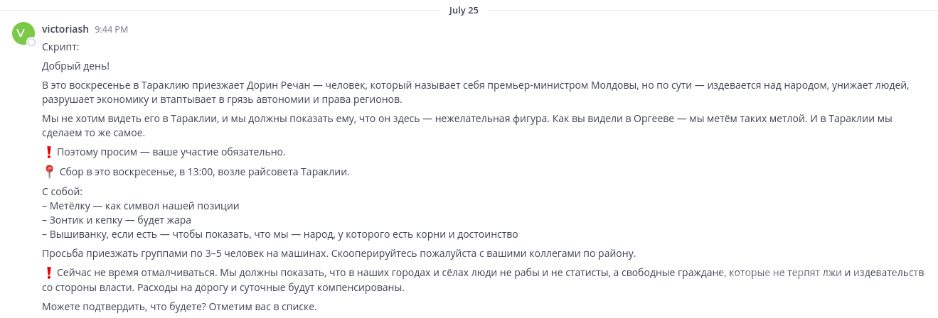 The group’s conversations also reveal that protests were planned on the eve of Prime Minister Dorin Recean’s visit to Taraclia on July 27. People were urged to bring brooms and organize themselves into groups of 3-5 people.